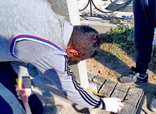Замываем брусчатку и снимаем с надгробья защищающий надпись и фотокерамику скотч, протираем памятник от строительной пыли.
